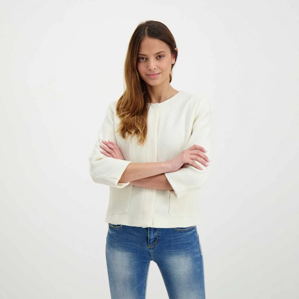 Realizzata in tessuto lavorato misto viscosa, è caratterizzata dal taglio corto e dalla vestibilità aderente a girocollo con maniche a tre quarti, chiusura nascosta con bottoni a pressione e tasche frontali.
