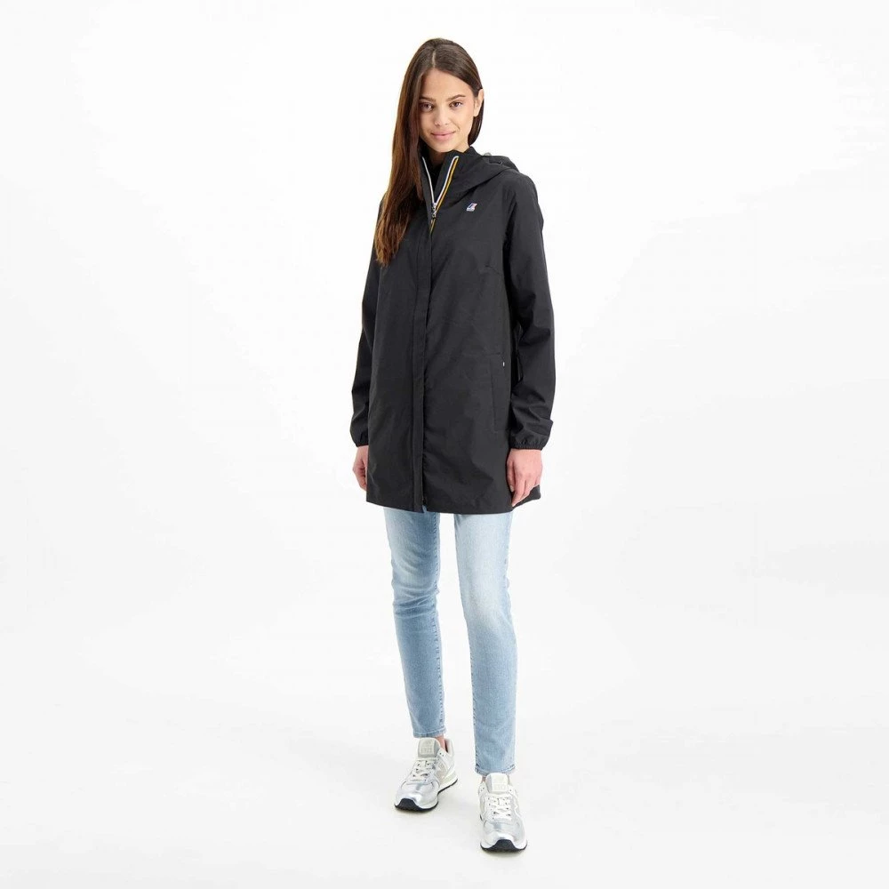 Realizzato in tessuto tecnico sintetico elasticizzato con cuciture termonastrate, è caratterizzato da una vestibilità regular, per la massima libertà di movimento. Impermeabile, traspirante e idrorepellente, è l’ideale per affrontare le temperature più miti. Design essenziale, presenta membrana interna con stampa all over K-Way, chiusura centrale full zip, cappuccio regolabile, rifinitura con nastro elastico sui polsi e tasche con zip.